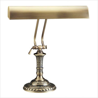 P14-242-71 Features: -Two light piano / desk lamp. -Antique brass finish. -Single adjustment arm. -Shade swivels to direct light. -Switch: In - line 6'' from base. Specifications: -Accommodates: (2) T10 incandescent bulbs (not included). -Bulb wattage: 40W or 60W. -Cord: 108'' brown. -Base dimensions: 6.38'' W x 6.38'' D. -Shade dimensions: 14'' W. -Overall dimensions: 8'' - 16'' H x 14'' W.